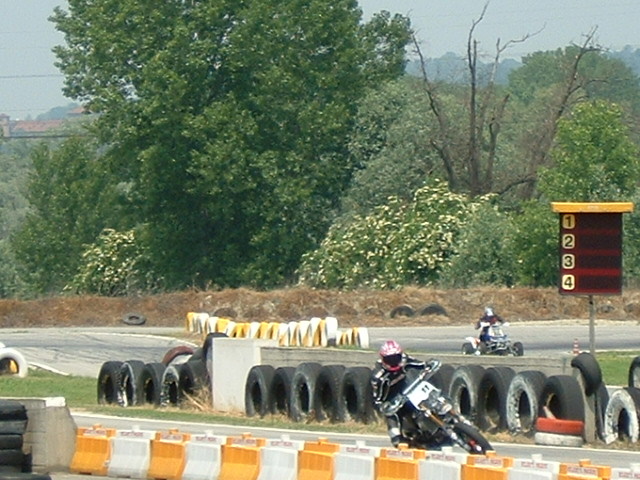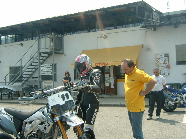 Un amico comune mi telefona alle 11.30 e mi dice "c'è Rubens che vuole andarsi ad allenare un paio d'ore con il Motard per tenersi in forma, mi trovi un posto tranquillo..." , io telefono al Kartodromo di Moncalieri, e organizzo l'uscita. Appuntamento alle 13.00 in Tangenziale Sud (TO) , arriva con 10 min. di ritardo ma lo scusiamo (non è del posto) finalmente arriviamo in kartodromo, scarichiamo la moto, lui si monta la termocoperta solo davanti, (io penso "chissà che derapate") un paio di controlli tappi olio,freno, bulloni vari e Vai "vediamo girare stò fenomeno" ma niente... nessuna derapata guida come in Gp-one mette giu il ginocchio e striscia la saponetta, eh.... è proprio vero certe abitudini sono dure da cambiare......................